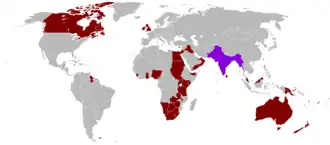 ![]() Территории, когда-либо бывшие частью Британской империи. Названия Британских заморских территорий подчёркнуты красным |
