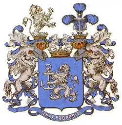 Щит увенчан дворянскими шлемом и короной на коей таковой же якорь. Намёт на щите голубой, подложенный серебром. Под щитом на голубой ленте надпись «TENAX PROPOSITI».
