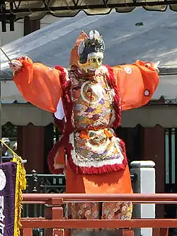 - быстрые танцы (хасиримоно), в которых актёры в масках изображают сверхъестественных и мифологических существ[26]. В общепринятом смысле танцы этой группы не являются быстрыми, а получили название хасиримоно («танец с бегом»), поскольку при их исполнении актёр передвигается по всей площадке, в отличие от других танцев, в которых действие разворачивается на пространстве не больше одного метра[28].