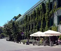 Четырехэтажное здание Библиотеки Варшавского университета (1994—1999) расположено на берегу Вислы и занимает целый квартал. Главный фасад — фасад Культуры — оформлен медной колоннадой с символическим значением портала Святыни знаний. Остальные три стены — Экологические фасады — увиты зеленью, ползущей по специальным каркасным сеткам. Стены оборудованы водосборниками, позволяющими питать растения дождевой водой. На крыше здания устроен сад — один из самых больших и красивых в Европе. Он, как и оболочка зелени на фасадах, выполняет не только эстетическую и рекреационную, но и экологическую функцию, защищая от пыли и сохраняя внутри помещений тепло зимой и прохладу летом. Задачам естественной энергоэкономии отвечает и компактный объем библиотеки. Здание представляет собой яркий и цельный архитектурный образ с трудом поддающийся стилевой классификации[2].