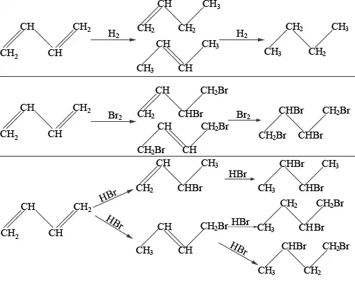 1,3-бутадиен является типичным бутадиеновым углеводородом и обладает высокой реакционной способностью. Легко вступает в реакции полимеризации, в том числе с другими непредельными соединениями — реакции сополимеризации (стиролом, эфирами и нитрилами акриловой и метакриловой кислот, изопреном, изобутиленом и др.). По двойной связи бутадиен присоединяет молекулы водорода, галогенов и галогеноводородов.