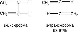 Молекулы 1,3-бутадиена могут находиться в s-цис- и s-транс-конформациях, причём последняя является преобладающей (93—97 %):
