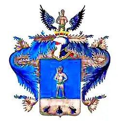 Щит увенчан дворянскими шлемом и короной, на поверхности которой между двух чёрных орлиных крыльев, виден выходящий человек с дубиной. Намёт на щите голубой и чёрный, подложенный серебром.
