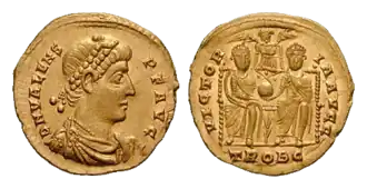 - ↑ В традициях классической латыни — FLAVIVS IVLIVS VALENS AVGVSTVS.