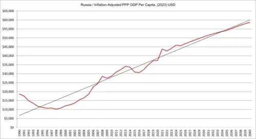 После финансового кризиса 1998 ВВП России начал неуклонно расти. Несмотря на это, номинальный ВВП России в долларах США оставался ниже своего исторического максимума вплоть до 2006 года. Реальный ВВП по ППС достиг значения 1990 года лишь к концу 2007 года[5]. Однако, структура экономики СССР и России кардинально отличалась: