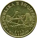 10 леков | 21,25 мм | 3.6 г | Рубчатый | Крепость Берат XIII век | Номинал в венке из лавровой и оливковой ветвей | Алюминиевая бронза | 1996-2000 г. |