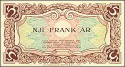 В период Итальянской оккупации 1939-1943 гг. курс франка был привязан к итальянской лире из расчёта 1 франк = 6,25 лиры.