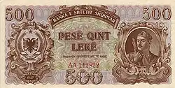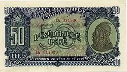 В 1949 году введена серия банкнот номиналами 10, 50, 100, 500 и 1000 леков. Вторая серия с аналогичным дизайном введена в 1957 году.