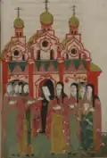 ![]() Епископ Суздальский Варлаам передает царю Ивану Васильевичу житие и чудеса преподобной Евфросинии | ||