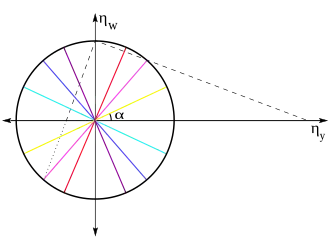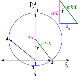 Другими словами, конец вектора импульса p движется по окружности радиуса mk/L, центр которой расположен в точке с координатами (0, A/L). Эксцентриситет e равен косинусу угла η, показанного на рис. 2. Для краткости вводится переменная . Круговой годограф полезен для описания симметрии задачи Кеплера.