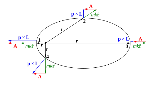 Из центральности силы следует, что вектор углового момента L также сохраняется и определяет плоскость, в которой движется частица. Вектор Лапласа — Рунге — Ленца A перпендикулярен вектору углового момента L и, таким образом, находится в плоскости орбиты. Уравнение A ⋅ L = 0 верно, потому что векторы p × L и r перпендикулярны L.