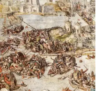 Турецкая эскадра у берегов Мальты и высадка (деталь) Маттео Перес Алеччо Дворец гроссмейстеров Мальтийского ордена | ||||||||||