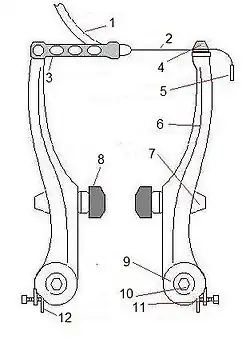 - Клещевые тормоза, «крабики», — U-образная форма сходящихся рычагов, в основном используются на шоссейных велосипедах и BMX. Устанавливались на передних колесах дорожных велосипедов, выпускавшихся в СССР (на гоночных велосипедах в СССР устанавливались на каждое колесо).