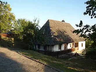 | Венгерская реформатская церковь (бывший Елизаветинский костёл XIII—XIV веков) в Хусте | Традиционный венгерский дом из села Вышково, ныне Хустский район Закарпатья, построен в 1879 году (находится в Ужгородском скансене). В архитектуре присутствует влияние русинского населения Верхней Тисы: срубная техника, полукрытая галерея, четырёхскатная крыша стропильной конструкции, украшение окон и двери | Традиционный венгерский женский костюм (юбка, сорочка, парта, рушник), из села Береги Береговского района Закарпатья |