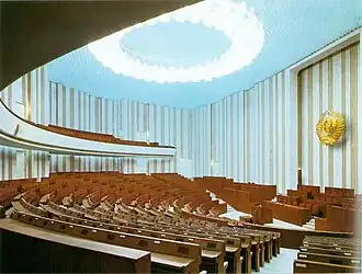 Срок полномочий Верховного Совета по Конституции 1936 года составлял 4 года, по Конституции 1977 года — 5 лет. Верховный Совет состоял из двух равноправных палат — Совета Союза и Совета Национальностей[34]. Палаты могли заседать как по отдельности, так и совместно. На заседаниях проходили выступления делегатов, голосования и консультации.