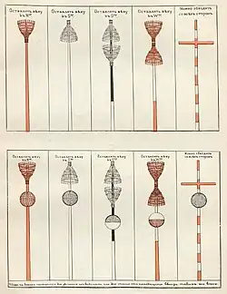 - вехи с красными флажками — вехи, ограждающие районы проведения водолазных, дноуглубительных, землечерпательных работ или работ, производящихся по подводным сооружениям.