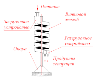 В винтовых сепараторах имеется неподвижный наклонный гладкий жёлоб, выполненный в виде спирали с вертикальной осью. Пульпа загружается в верхнюю часть жёлоба и под действием силы тяжести стекает вниз в виде тонкого, разной глубины по сечению жёлоба потока. При движении в потоке кроме обычных гравитационных и гидродинамических сил, действующих на зёрна, развиваются центробежные силы. Тяжёлые минералы концентрируются у внутренней границы жёлоба, а лёгкие — у внешней. Жёлоб винтовых сепараторов в поперечном срезе представляет собой 1/4 окружности или вытянутого эллипса. На конце жёлоба находится разделяющие ножи, которые делят поток на две части, содержащие разные продукты. Внешний вид винтового сепаратора приведён на рисунке.
