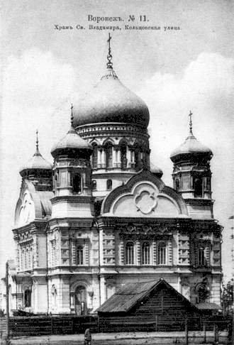 Архитектором здания являлся Александр Антонович Кюи, ученик Константина Тона. Размах строительства был колоссальным по тем временам, поэтому денежные средства изыскивались из разных источников — пожертвования священников епархии и простых жителей, отчисления Митрофановкого монастыря, пожертвования состоятельных людей (купец Зубов отдал 20 тысяч рублей на строительство, за что его должны были похоронить у храма). В «Воронежских губернских ведомостей» выходил отчёт о строительстве храма, а также публиковался список влиятельных лиц, пожертвовавших крупные суммы денег. Рядом со стройкой разместили временную деревянную часовню. В 1909 году строительство было окончено. Владимирский храм имел пять глав, великолепный лепной фасад. Размер церкви 36 на 32 метра.