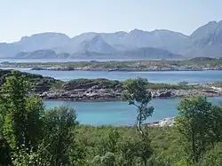| Gimsøystraumen между Гимсёем и Ауствогёем | Башни Вогакаллен над Хеннингсвером, вид из Кабельвога | Вид с востока на Вогакаллен | |||