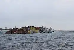 С целью недопущения выхода украинских кораблей из Донузлава в Одессу в ночь с 5 на 6 марта 2014 года на выходе из озера был затоплен списанный большой противолодочный корабль «Очаков» (длина около 180 метров), принадлежавший РФ. «Очаков» лёг на борт, заблокировав выход из залива[41]. В украинских СМИ сообщалось о затоплении и спасательного буксирного судна «Шахтёр»[42].