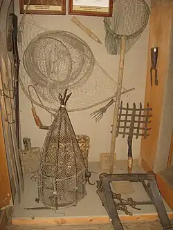В экспозиции также представлены предметы рыболовства: короб, глиняные грузила, ости, сачки, мережа, наконец, фотографии озер и рек волости.