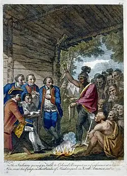 ![]() На совете 27 апреля 1763 года Понтиак призывает слушателей напасть на британцев. А. Боббет, гравюра XIX века | |||