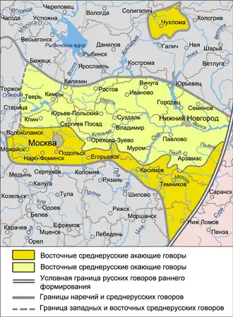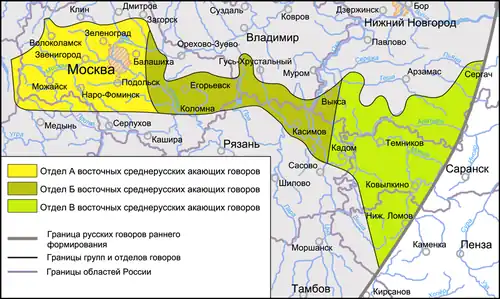 Восточные среднерусские акающие говоры размещаются к югу от Владимирско-Поволжской группы и примыкают к говорам южнорусского наречия в их северной части, занимая территории большей части Московской области (на западе, в центре и на востоке), северо-востока Рязанской области, южных районов Нижегородской области, восточной части Мордовии и северо-запада Пензенской области. Северо-западную часть Костромской области занимают чухломские говоры.