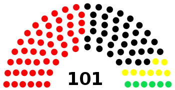 | Партия | Голоса за избирательный округ | Прямые места | Национальные голоса | Мест | Изменений | |||
