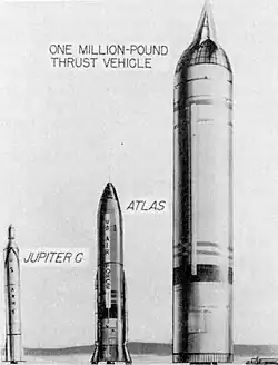 Идея создания сверхдальнобойных ракет для покрытия всего земного шара была не нова. Американцы приступили к созданию сверхмощных ракетных двигателей с тягой превышающей миллион фунтов (453 тонны) ещё в 1953 году[1], в 1958 году было официально объявлено об уже ведущихся работах над суперракетами, в дополнение к имеющимся «Юпитеру», «Атласу» и экспериментальному «Минитмену»,[2] но за пределы опытно-конструкторских работ и стендовых испытаний ракетных двигателей дело не дошло в силу нецелесообразности и бесперспективности (географическое расположение СССР относительно Соединённых Штатов и стран НАТО делало ненужным разработку ракет с дальностью стрельбы свыше уже имеющихся межконтинентальных ракет и БРСД, появление других вероятных противников для применения сверхдальнобойных ракет в обозримом будущем не предвиделось). Тематика создания сверхмощных ракетных двигателей была полностью передана НАСА из компетенции Управления стратегических ракетных сил ВВС США в целях освоения космоса (между тем, двигатели с тягой свыше миллиона фунтов были созданы и успешно испытаны отдельно друг от друга компаниями Aerojet General и North American Rocketdyne,[3] работу по глобальным системам наведения выполняли по отдельности Arma и IBM[4]).