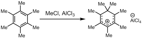 Обработка гексаметилбензола суперэлектрофильной смесью метилхлорида и трихлорида алюминия даёт гептаметилбензольный катион, один из первых карбокатионов, который будет наблюдаться непосредственно.