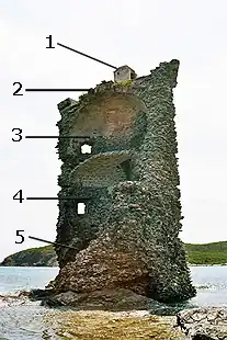 | 1 :бартизан (guardiola) 2 :терраса | 3 :помещение стражи 4 :комната отдыха 5 :кладовая |