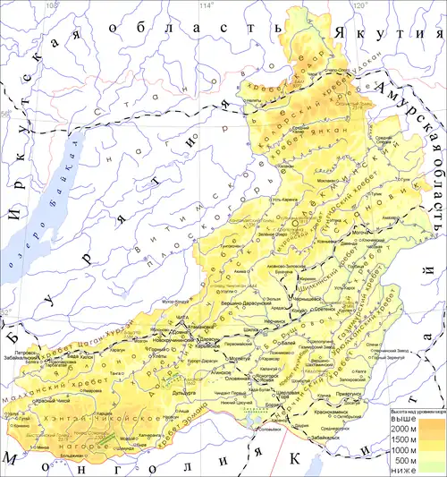 Внешние границы. На севере Забайкальский край граничит с Иркутской областью (протяженность границы 520 км) и Республикой Саха (Якутия) (200 км), на западе с Республикой Бурятия (самая протяженная граница края — 1700 км), на востоке с Амурской областью (700 км), на юге проходит государственная граница с Монголией (863 км) и Китаем (более 1000 км). Общая протяжённость границ края — около 5000 км.
