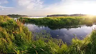 Почти всю восточную половину Московской области занимает обширная Мещёрская низменность, в восточной своей части значительно заболоченная. Границами её в пределах Московской области служат реки: Москва на западе, Клязьма на севере и Ока на юге. Самый высокий холм Мещёрской низменности (на древней моренной возвышенности в районе Егорьевска[35]) имеет высоту 214 м над уровнем моря; преобладают высоты 120—150 м; речные долины выражены слабо[37]. Низменность сложена известняками карбона, которые перекрыты юрскими глинами. Моренных образований мало (в основном они расположены близ Егорьевска и в западной части низменности). Почти все крупные озёра Мещёрской низменности (Чёрное, Святое и др.) имеют ледниковое происхождение, однако встречаются и карстовые озёра, отличающиеся правильной округлой формой, большей прозрачностью воды и значительной глубиной. В пределах Мещёры расположена самая низкая в регионе естественная высота — уровень воды Оки — около 97 метров[37].