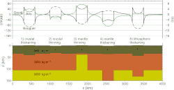 Гравитационные аномалии, вызванные аномальным распределением плотности земного шара, приводят к изменениям высоты поверхности геоида[11]. Таким образом, измерения геоида помогают понять внутреннюю структуру нашей планеты. Расчёты показывают, что геоидальная сигнатура утолщённой земной коры (например, в тектогенезе, вызванном столкновением материков) является положительной, в противоположность тому, что следует ожидать, если утолщение затрагивает всю литосферу.