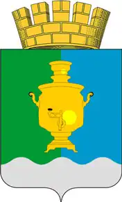 В рассеченном зеленью и лазурью поле с серебряной волнистой оконечностью золотой самовар с двумя ручками и закрытым краном.