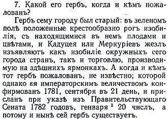 Герб города, утверждённый Екатериной II в 1781 г., с официальным описанием. Из Гербовника Винклера