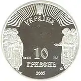 На аверсе: на фоне лучей — малый государственный герб Украины, запорожцы, логотип Монетного двора НБУ, надписи «УКРАЇНА 10 ГРИВЕНЬ 2005», обозначение металла и его проба — Ag 925, вес чистого серебра — 31,1. На реверсе: 4 портрета в медальонах, под ними надписи «ДЕМ`ЯН МНОГОГРІШНИЙ, ІВАН САМОЙЛОВИЧ, ІВАН МАЗЕПА, КИРИЛО РОЗУМОВСЬКИЙ», над портретами — герб Батурина, внизу — вид города с лубочной картинки середины XIX в., вверху — надпись «ГЕТЬМАНСЬКА СТОЛИЦЯ БАТУРИН». |