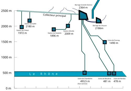 Вода из основного водохранилища используется четырьмя гидроэлектростанциями суммарной мощностью 2069 МВт и годовым производством электричества 2 млрд кВт⋅ч в год (КИУМ ≈12 %). Для снабжения водой ГЭС Шандолин, Фионней, Нендаз и Бьедрон используются три водовода, вода после станций поступает в реку Рона[3].