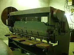 Гильотина, гильотинные ножницы (фр. guillotine) — механическое устройство для резки материалов, имеющие в своей конструкции косой подвижный нож, двигающийся в одной плоскости без изменения угла наклона. Предназначены для прямой продольной и поперечной резки листового и полосового материала из стали, цветных металлов и их сплавов на начальном этапе производства. Основное преимущество ножниц гильотинного типа состоит в том, что в момент реза, давление на разрезаемый материал производится не по всей длине реза, что снижает требуемое усилие. Так же рубка стального листа гильотиной позволяет практически исключить потери металла в виде стружки.[1] Чем больше угол наклона, тем меньше усилие и хуже качество реза[2][3].