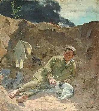 Пехота РККА, «Перед началом наступления». Солдаты читают боевой листок перед началом наступления, 3 сентября 1943 года. При наличии на всех солдатах недавно введённых погон, у некоторых устаревшие каски СШ-36- Гимнастёрка военнослужащего морской пехоты ВМФ СССР 1943 года