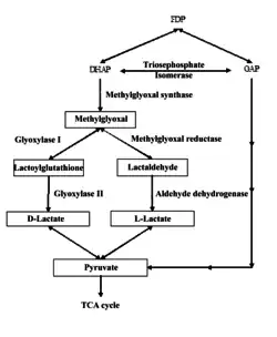 Некоторые модификации гликолиза обнаружены у бактерий. В частности, когда окисление глицеральдегид-3-фосфата на стадии 6 глицеральдегид-3-фосфатдегидрогеназой ограничено низким содержанием фосфата в среде, у E. coli и некоторых других бактерий дигидроксиацетонфосфат окисляется до пирувата через три реакции, составляющие метилглиоксалевый шунт. В реакции 1 лиаза отщепляет фосфат с образованием метилглиоксаля. В реакции 2 метилглиоксаль присоединяет воду, превращаясь в лактат, вод воздействием глиоксилазы. В реакции 3 лактат окисляется мембраносвязанной флавин-содержащей D-лактатооксидазой до пирувата. Если содержание фосфата в среде высоко, то метилглиоксалевый шунт не функционирует, так как лиаза ингибируется фосфатом[37].