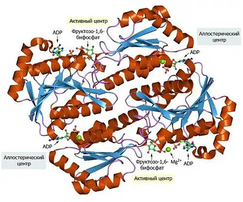 В третьей реакции гликолиза, протекающей с затратой АТФ, фермент фосфофруктокиназа-1 катализирует перенос фосфорильной группы от АТФ на фруктозо-6-фосфат с образованием фруктозо-1,6-бисфосфата[8]: