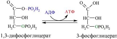 Фермент фосфоглицераткиназа переносит высокоэнергетическую фосфорильную группу с карбоксильной группы 1,3-бисфосфоглицерата на АДФ, в результате чего образуются АТФ и 3-фосфоглицерат[15]: