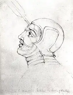 Гароль Годвинсон, or Гарольд II английский (ок. 1022 — 14 октября 1066), последний англосаксонский король Англии, убитый в битве при Гастингсе, борясь с норманскими завоевателями, руководимыми Вильгельмом Завоевателем. В «Истории норманов» Аматуса Монтекассино (Amatus of Montecassino), написанной 30 лет спустя Гастингской битвы, было сказано, что Гарольд погиб от стрелы, пронзившей его глаз, что ясно показано на рисунке Блейка. Рисунок был упомянут в журнале «Урания» («Urania», 1825, p. 407): «Картина мистера Блейка 'Страшный Суд', его профильные портреты Уоллеса, Эдуарда VI, Гарольда, Клеопатры и многие другие поистине замечательны по тому духу с которым они изображены.» |