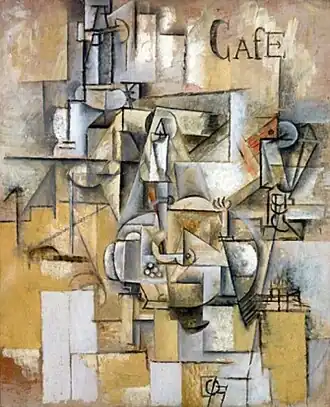 Сюжет картины довольно запутанный, и сложно точно распознать на холсте какой-либо предмет. Среди различных прямоугольников, дуг и линий хорошо видно только слово «Café» в верхней правой части полотна. Ближе к геометрическому центру композиции на столике стоит блюдо, приготовленное из голубя. Можно заметить торчащую вверх птичью лапу и зелёный горошек на тарелке. В картине преобладает светло-коричневый цвет, который местами усиливается и становится почти незаметным по краям холста.