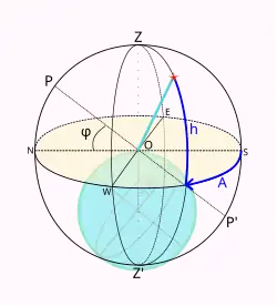 Азимутом A светила называется дуга математического горизонта от точки юга до вертикала светила. Азимуты отсчитываются в сторону суточного вращения небесной сферы, то есть к западу от точки юга, в пределах от 0° до 360°[1]:41. Иногда азимуты отсчитываются от 0° до +180° к западу и от 0° до −180° к востоку (внимание, в геодезии и навигации азимуты отсчитываются от точки севера[4]).