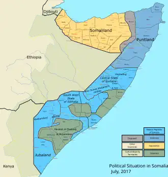 Сомали — федеративная республика, состоящая из пяти федеративных регионов, а также самопровозглашённого государства Сомалиленд. Де-факто, север Сомали разделён между автономным регионом Пунтленд (который рассматривает себя как автономное государство) и Сомалилендом. В центральном Сомали, Галмудуг — другая региональная единица, находящаяся к югу от Пунтленда[1].