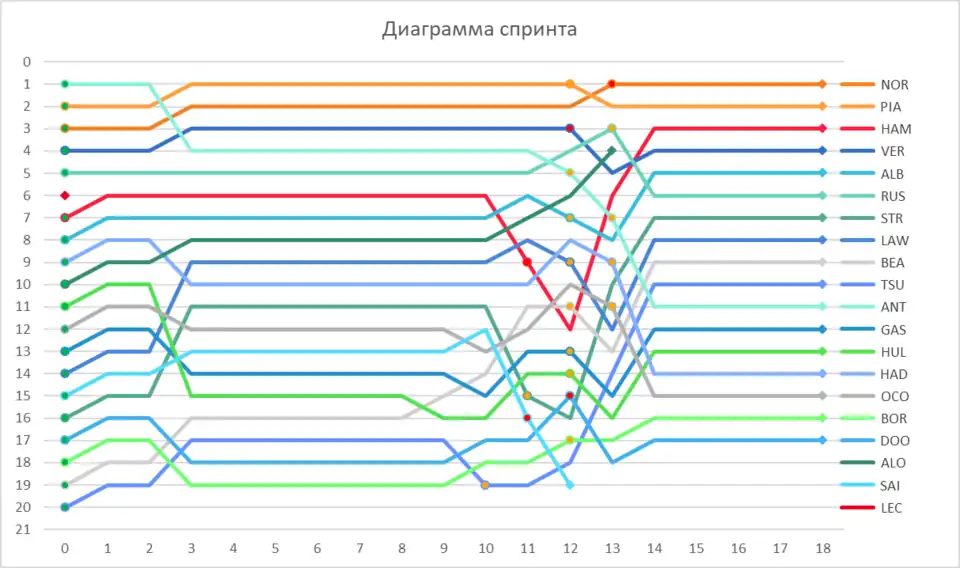 - ↑ Юки Цунода квалифицировался 18-м, но стартовал в спринте с пит-лейн, так как его автомобиль был модифицирован в условиях закрытого парка.