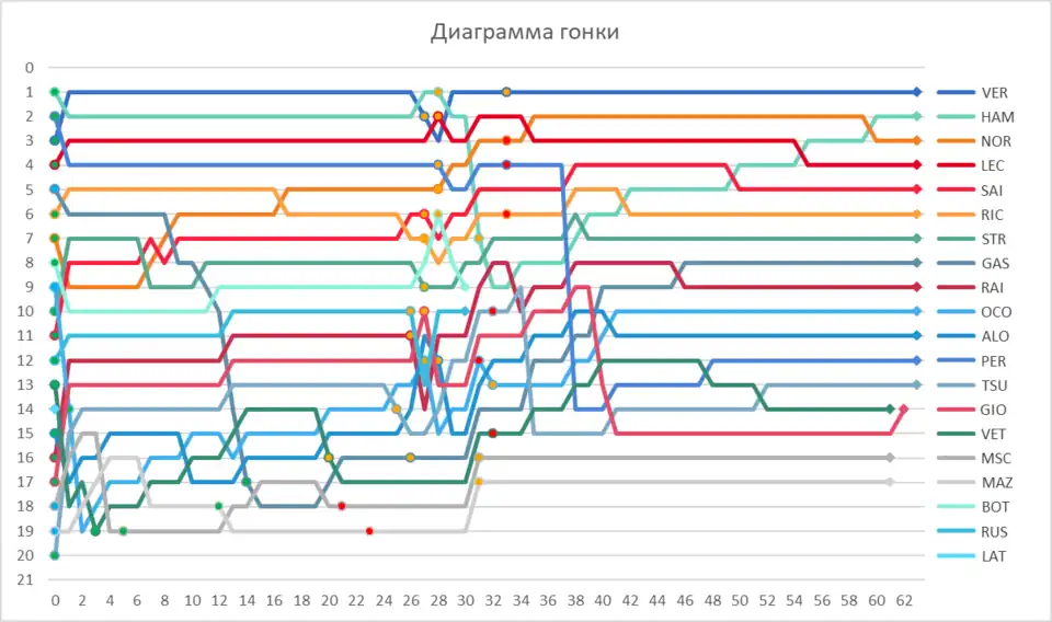 Поучаствовал Расселл и в следующем эпизоде: обгоняя Боттаса, на влажной трассе он заехал на траву, в результате обе машины столкнулись, и для расчистки трассы пришлось вывесить красные флаги. После рестарта Ферстаппен остался лидером, на третье место, Хэмилтон же смог стать вторым, установив попутно быстрый круг гонки. Далее финишировали гонщики Феррари (4-й и 5-й), напарник Норриса Риккардо, Гасли, Стролл и гонщики «Альпин», уже во второй гонке за новую команду заработав очки. Райкконен финишировал 9-м, но получил штраф за неверные действия в режиме машины безопасности. Перес при старте с первого ряда провел невзрачную гонку, на мокрой трассе несколько раз ошибался и не заработал очков.