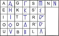 Греко-иберский алфавит содержит 16 знаков, идентичных греческим, за исключением знака, соответствующего второму ротическому: пять гласных, только один назальный, один латеральный, два сибилянта, два ротических, три звонких окклюзивных (лабиальный, дентальный и велярный), но только по одному глухому окклюзивному (дентальный и велярный). Для передачи второго ротического к букве «ро» добавлен дополнительный штрих. Для передачи звука «e» вместо буквы «эта» выбран «эпсилон». Для второго сибилянта выбран знак «сампи».